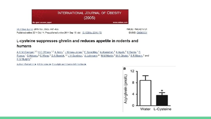 L-Cysteine ➢ Amino acid ➢ Protein rich meals produce greater satiation ➢ ↓ ghrelin release and ↓ appetite in humans and mice fed L-cysteine Cystathionine gamma-lyase (CSE)