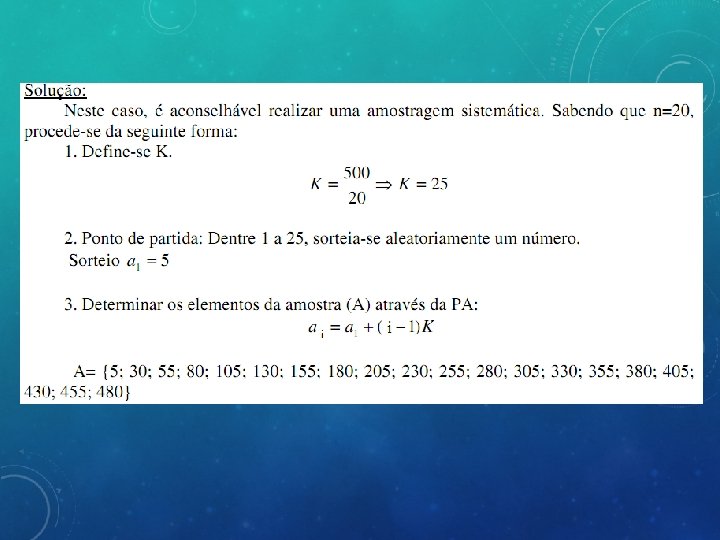 AMOSTRAGEM SISTEMÁTICA • Uma amostra obtida selecionando-se aleatoriamente uns elementos entre os K primeiro elementos de um sistema de referência e, após esse, cada k-ésimo elemento, é chamada sistemática.
