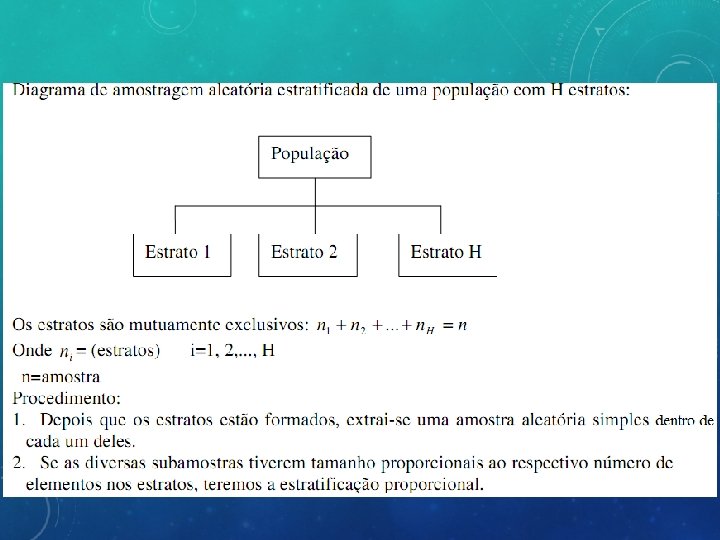 AMOSTRAGEM ESTRATIFICADA • No primeiro tipo sorteia-se igual número de elementos em cada estrato. Esse processo é utilizado quando o número de elementos por estrato for aproximadamente o mesmo. • No outro caso, utiliza-se proporção para determinar o número de elementos de cada estrato que irão compor a amostra.