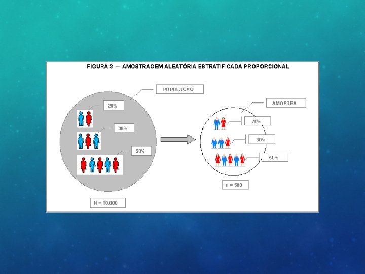 AMOSTRAGEM PROBABILÍSTICA • Uma amostra é representativa da população da qual foi selecionada se todos os membros da população tiverem a mesma chance (probabilidade) de serem selecionados para compor a amostra.