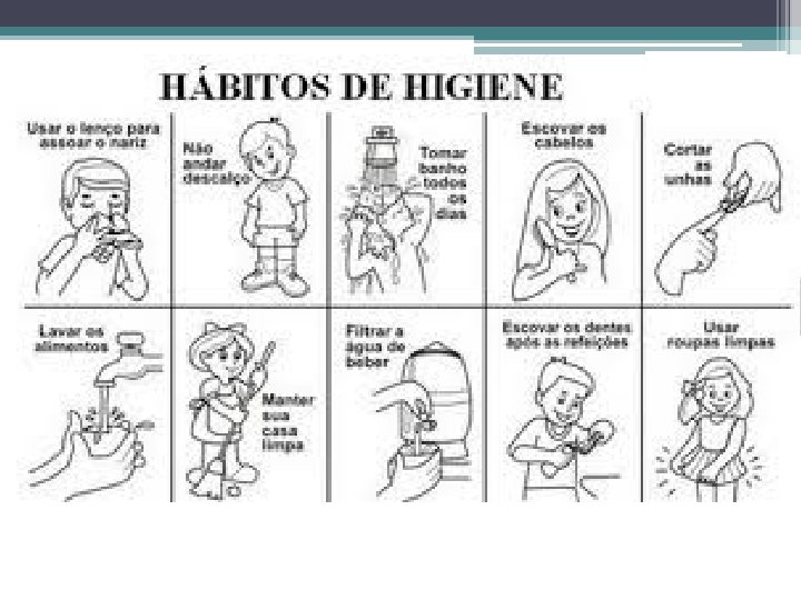 • Higiene Bucal: Fio dental todos os dias; Higiene bucal previne várias doenças e também mau hálito. ØCárie ØTártaro ØGengivite • Higiene pessoal: Lavar o rosto ao acordar e dormir. Banho uma vez por dia, usar sabão neutro. Cabelo pelo menos 2 vezes por semana, usando xampu e condicionador. Escovar todo dia, com uma escova só sua. • Higiene Pessoal – Lavar as mãos após o uso do banheiro, antes de preparar a comida e antes de comer.