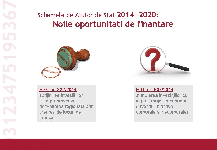 Schemele de Ajutor de Stat 2014 -2020: Noile oportunitati de finantare H. G. nr. 332/2014 sprijinirea investițiilor care promovează dezvoltarea regională prin crearea de locuri de muncă H. G. nr. 807/2014 stimularea investiţiilor cu impact major în economie (investitii in active corporale si necorporale)