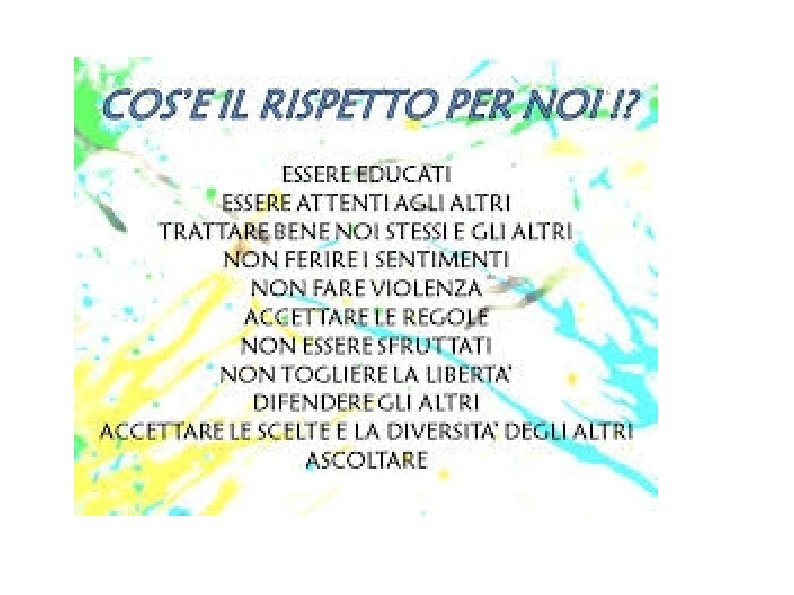 IL RISPETTO Il rispetto è un atteggiamento che si ha (o non si ha ) nei confronti degli altri che serve per mantenere dei rapporti equilibrati tra le persone. Il rispetto si manifesta in molte circostanze, come a scuola, al lavoro, a casa. Consiste principalmente nel seguire delle regole, perché è solo grazie ad esse che si sta bene tutti insieme, infatti senza regole il mondo sarebbe solo una massa di persone anarchiche. Noi tutti dobbiamo rispettare i diritti e i doveri che sono alla base delle regole del rispetto degli altri e non ci devono essere differenze tra grandi e piccoli.