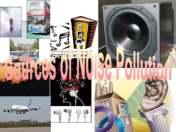 1. Jet planes. 2. Loud speakers and other loud speaking things. 3. Cinema halls. 4. Factories 5. Road traffic