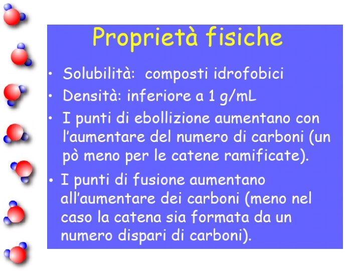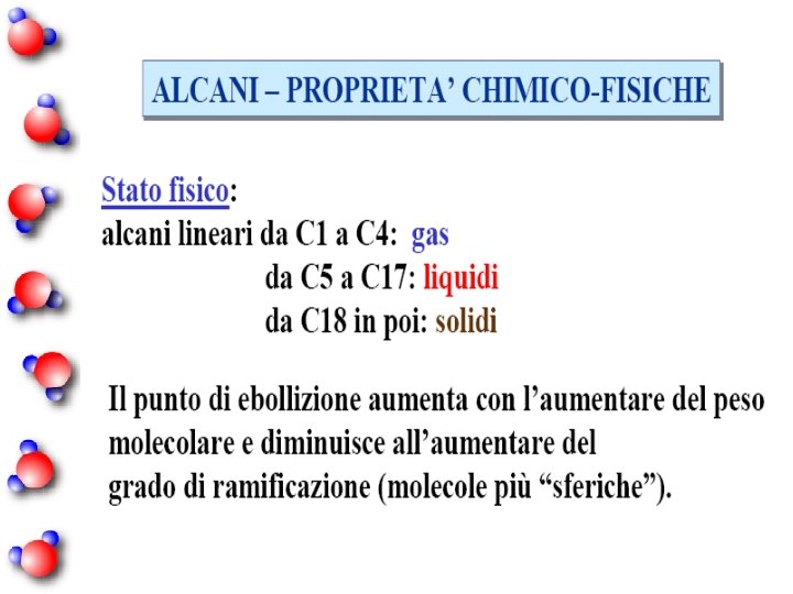 Alcani a catena lineare C 1 metano C 2 etano C 3 propano C 4 butano C 5 pentano C 6 esano C 7 eptano C 8 ottano C 9 nonano C 10 decano