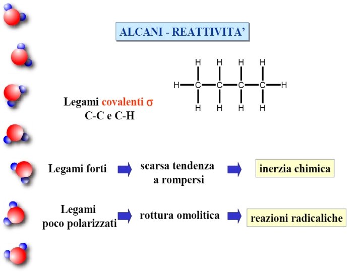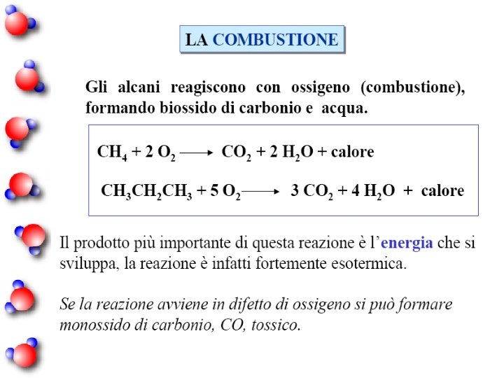 Combustione degli alcani Ossigeno in eccesso: CH 4 + 2 O 2 CO 2 + 2 H 2 O Ossigeno in difetto: 3 CH 4 + O 2 CO + 2 H 2 O 2 CH 4 + O 2 + H 2 O metanale
