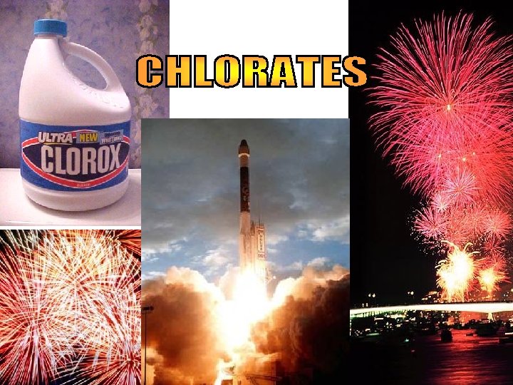 chlorite chlorate perchlorate Sodium hypochlorite Cl 2 Cl. O 3 Chlorate & perchlorate strong oxidizers Metallic chlorates & perchlorates turn into salt plus oxygen. KCl. O 3 KCl + O 2 Fireworks, explosives, O 2 for rocket fuel Cl. O 4