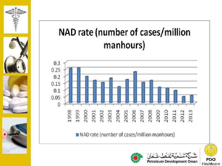 NAD - PDO Efforts q Over the years PDO has made much efforts in order to improve the well being of its workforce and to address health and lifestyle issues. q These efforts continues today and include: § The appointment of full time Head of OH in 2008 and the recent merger of OH and Medical Dept. as one Health Team – Nov. 2011 which ensures the implementation of Minimal health management STD. § The appointment of full time Public Health Advisor and full time Dietician /nutritionist in 2012 § Improved working and living Conditions(permanent accommodation for contractors, PACs) § Annual 1 month OH Road Shows to educate workers on various health topics including life style § NAD reporting and investigations- All NAD are now being discussed at MDIRC