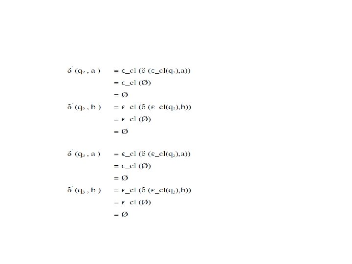 Є – Closure untuk Suatu Non. Deterministic Finite Automata dengan Є – Move • Є – Closure adalah himpunan state-state yang dapat dicapai dari suatu state tanpa membaca input. • Perhatikan gambar sebelumnya, maka diperoleh : • Є – Closure ( q 1 ) = { q 1, q 2 } • Є – Closure (q 2 ) = { q 2 } • Є – Closure ( q 3 ) = { q 3 }