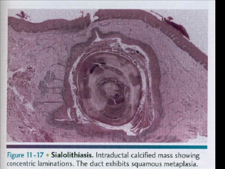 Sialolithiasis • The exact pathogenesis of sialolithiasis remains unknown. • Thought to form via…. an initial organic nidus that progressively grows by deposition of layers of inorganic and organic substances. • May eventually obstruct flow of saliva from the gland to the oral cavity.