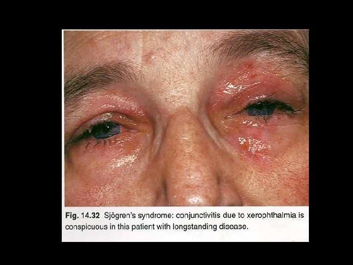 Primary Sjogren’s syndrome (Sicca complex) • Dry mouth and dry eyes Secondary Sjogren’s syndrome • Systemic lupus erythematosus, polyarteritis nodosa, polymyositis, scleroderma