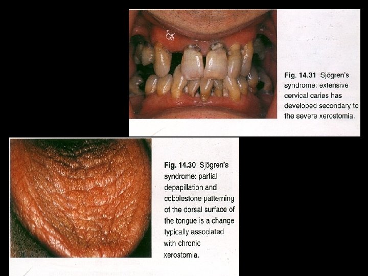 C/F • Often affects females • Middle age • Occurs with SS • Sudden onset of xerostomia, difficulty in swallowing • Tooth decay • Eyes - Enlarged lacrimal glands , decreased lacrimation • Fever