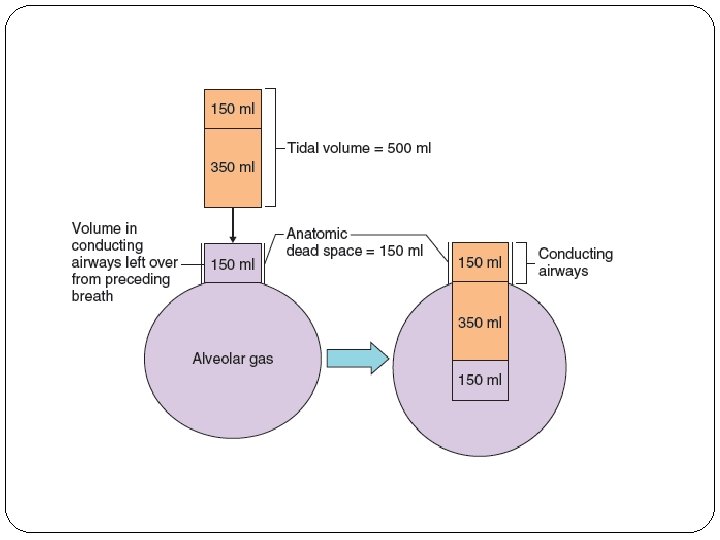 Dead Space �The part of the respiratory tract where the gaseous exchange does not take place �Function – Purification, Humidification & Air-conditioning �Types – 2 ü Anatomical dead space volume– volume Volume of gas in respiratory tract ( nose - terminal bronchiole). ü Normal value – 150 ml ü Physiological dead space volume - Total dead space volume Anatomical DSV + Volume of air in the alveoli which does not take part in the exchange of gas Normal healthy person – Physiological DSV = Anatomical DSV