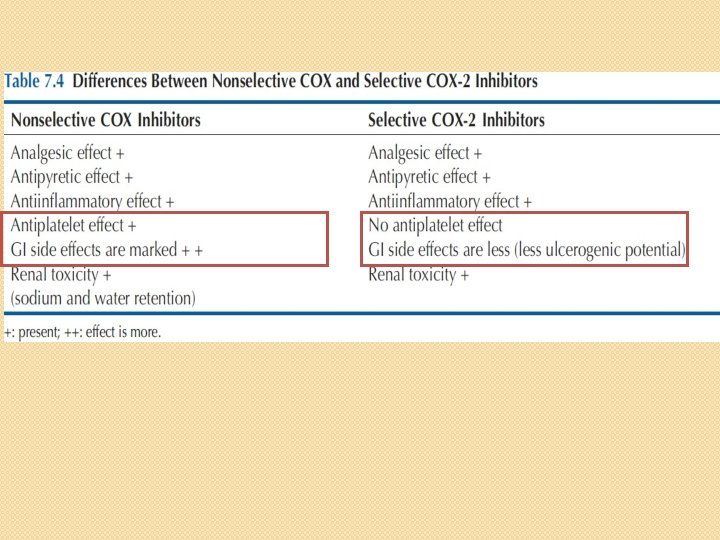 Selective COX-2 Inhibitors Celecoxib Parecoxib, Etoricoxib Similar Analgesic Antipyretic Analgesic action Lesser GIT side effects No Cardioprotective effects as it has no effect on platelet aggregation Uses are similar to traditional NSAIDS cardiovascular patients except for