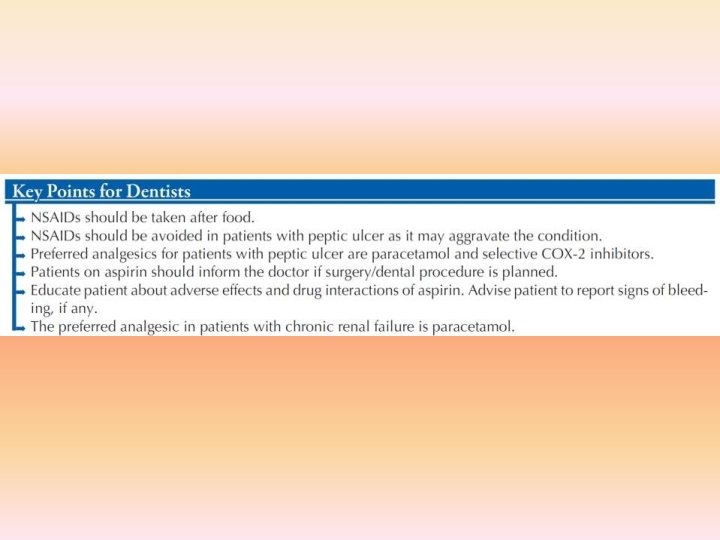 Adverse effects • Analgesic nephropathy – Salt &water retention & edema of lower limbs – Hyperkalemia – Interstitial nephritis – Slowly progressive renal failure may occur on chronic use of high doses of NSAIDs. Renal failure is usually reversible on stoppage of therapy but rarely, NSAIDs may cause irreversible renal damage. • Pregnancy – These drugs inhibit PG synthesis, thereby delay onset of labour and increase chances of postpartum haemorrhage.