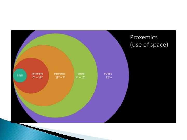 Types of Nonverbal Communication (Variables) PROXEMICS Proxemics refers to how perceptions of personal space and the use of physical space vary culturally. Researchers have identified four zones of personal space: o Intimate—touching to 18” o Personal— 18” to 4 -6 feet o Business or social— 4 -6 feet to 10 -12 feet o Public—beyond 12 feet Latin Americans and Arabs tend to perceive personal space as closer than the Germans or Japanese. Americans are in the middle of the range defined by those two extremes.