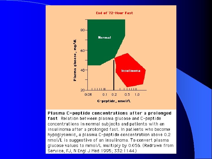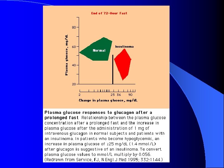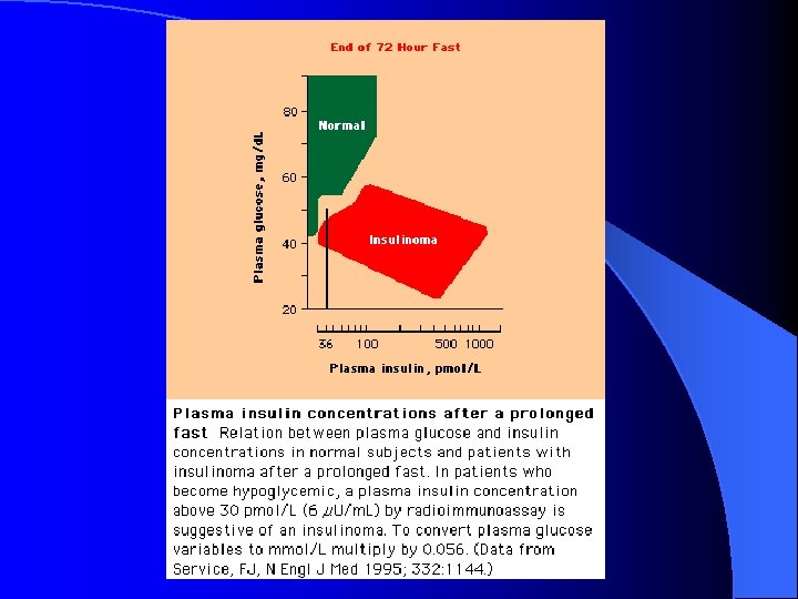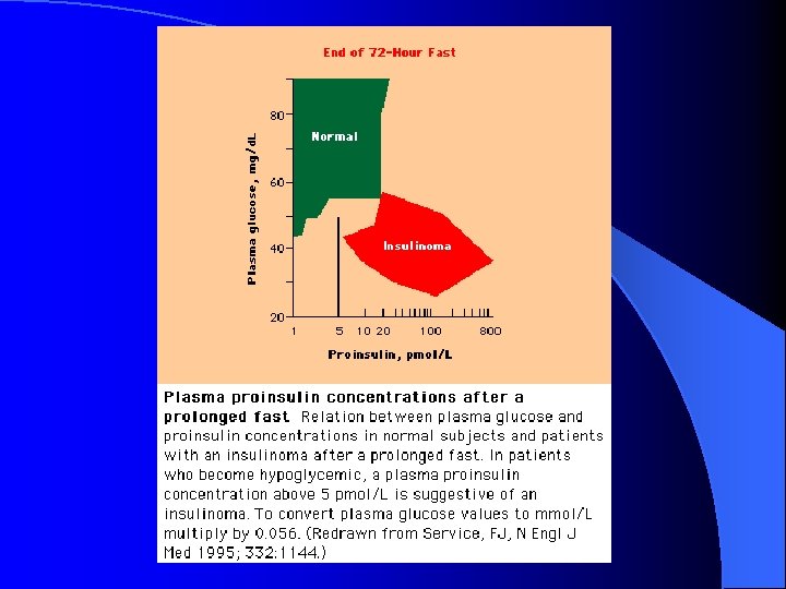 Hypoglycemia Symptoms after fasting or skipped meals? Symptoms (only adrenergic) after eating? OGTT Fasting Hypoglycemia 75 g glucose, BS q 30 min x 5 h BS < 2. 8 m. M? If yes: avoid refined sugars FPG >2. 8 m. M < 2. 8 m. M Insulin < 3 u. U/m. L (21. 5 p. M) 72 h fast Insulin/glucose < 0. 3 • AI, hypothyroid • Liver Disease, Et. OH BG < 2. 8 m. M? C-peptide • Enzyme defects • Severe, protracted NO > 0. 2 n. M malnutrition < 0. 2 n. M • Non-islet cell tumor • Secretes IGF-II • Vigorous exercise. Insulinoma OHA • Secretes IGFI • Glucagon OHA screen – OHA screen + BP inhibitor Surreptitious Insulin YES stimulation (rise BS > 1. 4 m. M) Prosinsulin: > 5 p. M > 10 -20% > 3 u. U/m. L (21. 5 p. M) Insulin/glucose > 0. 3 Proinsulin: < 5 p. M < 10 -20% Anti-insulin Ab’s