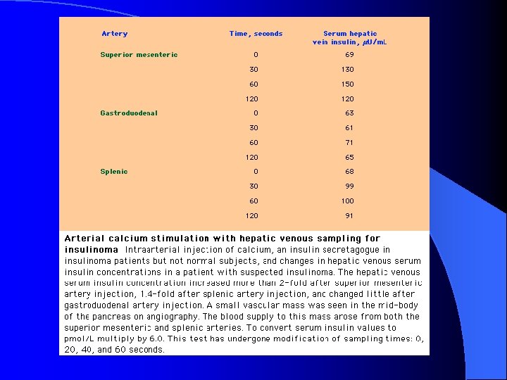 Insulinoma l Diagnosis: Biochemical l Localization: l – – CT Scan Octreoscan (60% Sen) Intraop U/S – most sensitive test Selective arterial Ca 2+ stimulation