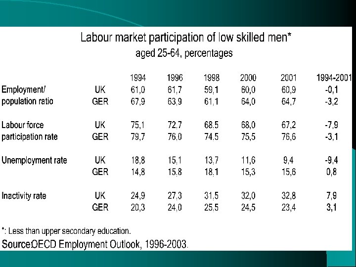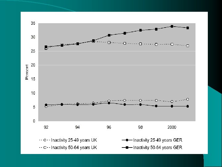 General results Some comparative insights into transitions in and out of inactivity l Some insights into the effect of welfare state legislation on moves in and out of employment and (various states of) non-employment l Declining unemployment in the UK after 1993 due to labour market improvement, and stronger disincentives to become unemployed after losing a job l JSA has contributed to labour market detachment of prime-aged men (but not older workers) l