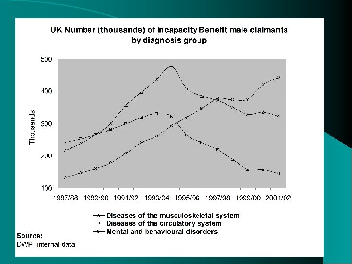 Number of claims and average duration of claims for Invalidity/Incapacity benefit male claimants (thousands) 1990 1992 1994 1996 1998 2000 2002 1, 085. 8 1, 372. 1 1, 544. 4 1, 672. 5 1, 551. 6 1, 391. 5 1, 468. 0 4, 01 3, 96 4, 71 4, 92 5, 24 5, 64 5, 90