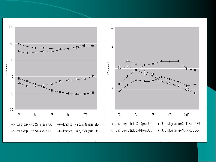 General results Some comparative insights into transitions in and out of inactivity l Some insights into the effect of welfare state legislation on moves in and out of employment and (various states of) non-employment l Declining unemployment in the UK after 1993 due to labour market improvement, and stronger disincentives to become unemployed after losing a job l JSA has contributed to labour market detachment of prime-aged men (but not older workers) l