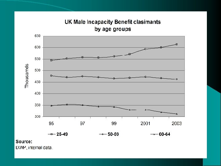 Number of claims and average duration of claims for Invalidity/Incapacity benefit male claimants (thousands) 1990 1992 1994 1996 1998 2000 2002 1, 085. 8 1, 372. 1 1, 544. 4 1, 672. 5 1, 551. 6 1, 391. 5 1, 468. 0 4, 01 3, 96 4, 71 4, 92 5, 24 5, 64 5, 90