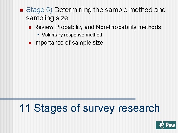 n Stage 5) Determining the sample method and sampling size n Review Probability and Non-Probability methods • Voluntary response method n Importance of sample size 11 Stages of survey research