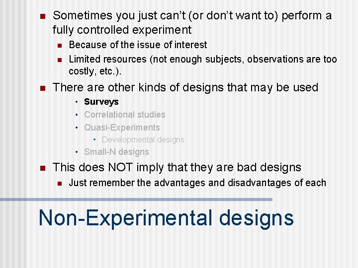 n Sometimes you just can’t (or don’t want to) perform a fully controlled experiment n n n Because of the issue of interest Limited resources (not enough subjects, observations are too costly, etc. ). There are other kinds of designs that may be used • Surveys • Correlational studies • Quasi-Experiments • Developmental designs • Small-N designs n This does NOT imply that they are bad designs n Just remember the advantages and disadvantages of each Non-Experimental designs