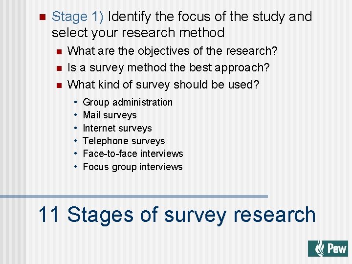 n Stage 1) Identify the focus of the study and select your research method n n n What are the objectives of the research? Is a survey method the best approach? What kind of survey should be used? • • • Group administration Mail surveys Internet surveys Telephone surveys Face-to-face interviews Focus group interviews 11 Stages of survey research