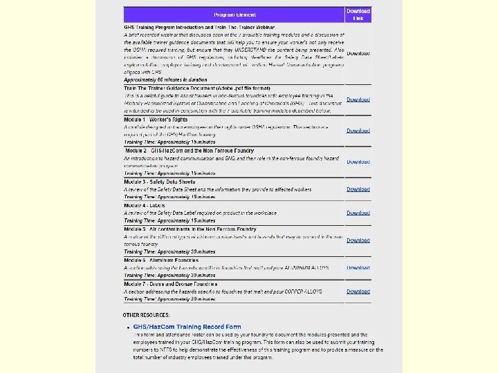 The Training Modules The program includes 7 training modules: Module 1: Worker’s Rights Under OSHA n Module 2: GHS/Haz. Com and the Non-Ferrous Foundry n Module 3: Safety Data Sheets n Module 4: Labels n Module 5: Air Contaminants in the Non-Ferrous Foundry n Module 6: Aluminum Foundries n Module 7: Brass and Bronze Foundries n