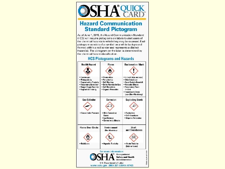 ADDITIONAL RESOURCES FOR TRAINERS AND EMPLOYEES Hazard Communication Safety Data Sheets (OSHA 3493 - 2012) (English: HTML PDF* ) Hazard Communication Standard Labels (OSHA 3492 - 2012) (English: PDF* ) (OSHA 3492 - 2012) (Spanish: PDF* )3 Hazard Communication Standard Pictogram Quickcard (OSHA 3491 - 2012) (English: PDF* ) (OSHA 3491 - 2012) (Spanish: PDF* ) Hazard Communication Standard: Comparison of NFPA 704 and Haz. Com 2012 Labels Quick. Card (OSHA 3678 - 2013) (English: PDF*) Heat Stress Quickcard™ Exposure to heat can cause illness and death. Learn of precautions your employer should take any time temperatures are high and the job involves physical work. 2 pages (OSHA 3154 - 2014) (English: PDF* ) (OSHA 3417 - 2011) (Spanish: PDF* ) (OSHA 3389 - 2011) (Vietnamese: PDF* ) Hydrogen Sulfide Quick. Card™ (OSHA 3300 - 2005) (English: HTML PDF* ) (OSHA 3300 - 2005) (Spanish: HTML PDF* ) Lead: If You Work Around Lead, Don’t Take it Home! Quickcard (OSHA 3736 - 2014) (Spanish: PDF* )