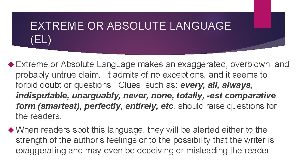 EXTREME OR ABSOLUTE LANGUAGE (EL) Extreme or Absolute Language makes an exaggerated, overblown, and probably untrue claim. It admits of no exceptions, and it seems to forbid doubt or questions. Clues such as: every, all, always, indisputable, unarguably, never, none, totally, -est comparative form (smartest), perfectly, entirely, etc. should raise questions for the readers. When readers spot this language, they will be alerted either to the strength of the author’s feelings or to the possibility that the writer is exaggerating and may even be deceiving or misleading the reader.