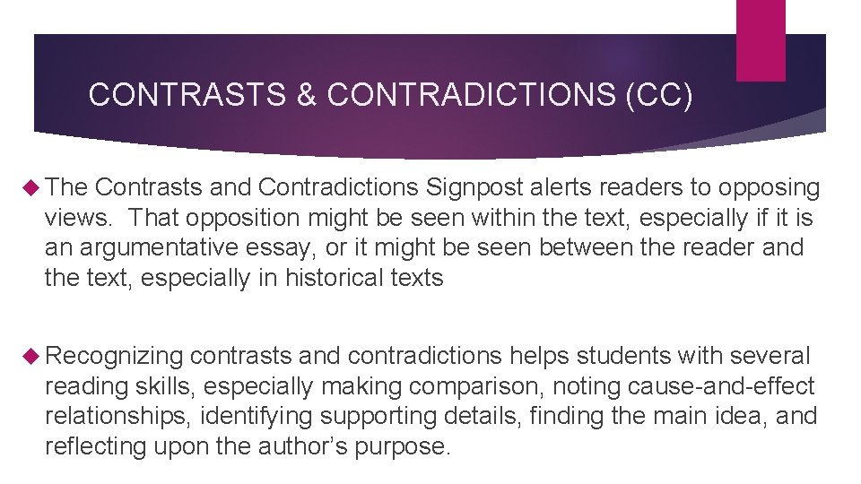 CONTRASTS & CONTRADICTIONS (CC) The Contrasts and Contradictions Signpost alerts readers to opposing views. That opposition might be seen within the text, especially if it is an argumentative essay, or it might be seen between the reader and the text, especially in historical texts Recognizing contrasts and contradictions helps students with several reading skills, especially making comparison, noting cause-and-effect relationships, identifying supporting details, finding the main idea, and reflecting upon the author’s purpose.