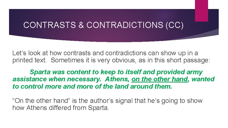 CONTRASTS & CONTRADICTIONS (CC) Let’s look at how contrasts and contradictions can show up in a printed text. Sometimes it is very obvious, as in this short passage: Sparta was content to keep to itself and provided army assistance when necessary. Athens, on the other hand, wanted to control more and more of the land around them. ”On the other hand” is the author’s signal that he’s going to show Athens differed from Sparta.