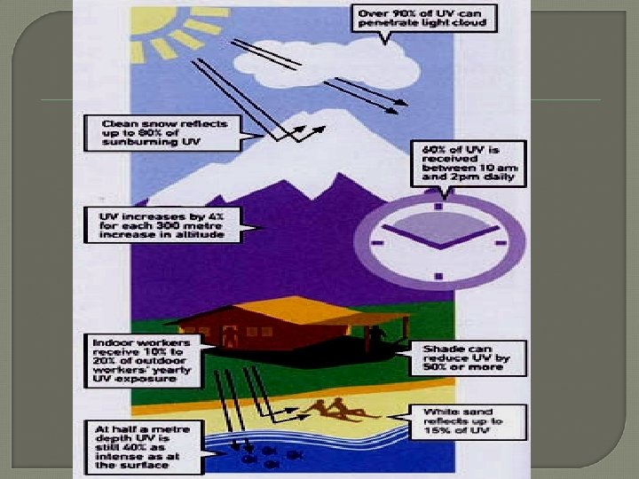 Effects of UV Radiation on Human Body Skin: Erythema „early red coloured skin inflammation“(appears after 2 -3 hours) Tanning (delayed pigmentation, because production of melanine. ( it starts approx. 24 - 48 hours after exposure) Vitamine D production Skin Aging (Wrinkles, Dry skin, Skin cancermelanoma) Eye: Inflammation- Conjunctivitis, Pain, Cataract IMUNITY: increases. Overexposure - decreases