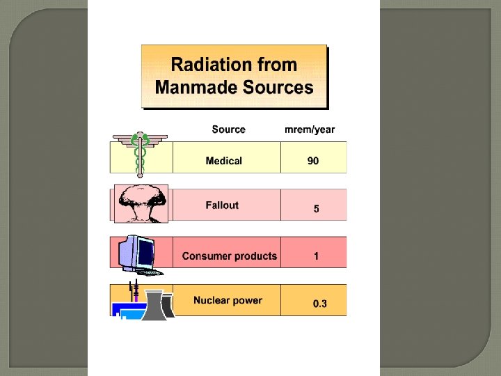 Quality Factor (Q) The specific value that accounts for the ability of different types of ionizing radiation to cause varying degrees of biological damage • X-rays, gamma rays, & beta particles 1 • Neutrons & High energy protons 10 • Alpha Particles 20