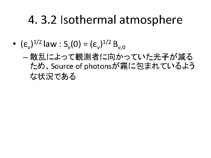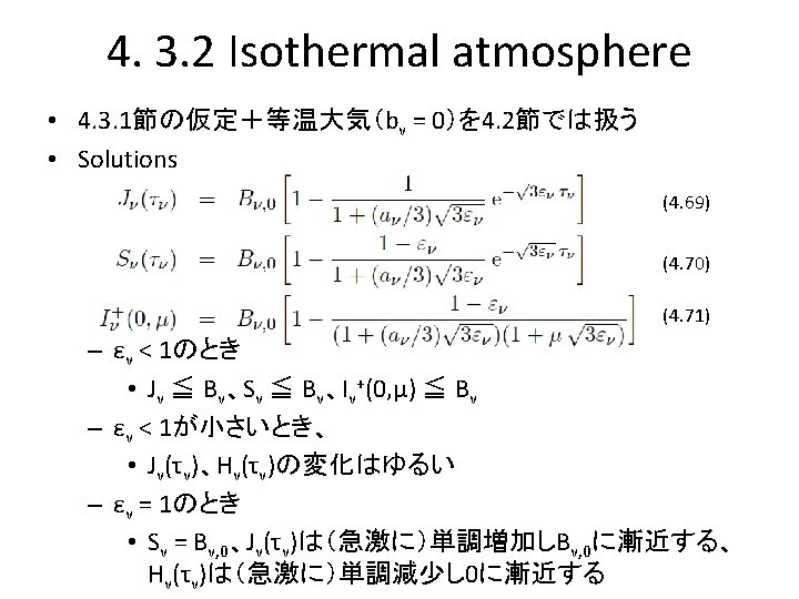 4. 3. 1 Coherent scattering in the Eddington approximation • Boundary conditions – Rossland or diffusion approximation • Jν = Bν for τν -> ∞ ∴ C 2 = 0 – No incident radiation at τν = 0 ∵ Eq. (4. 54) ανを定義 => ∵ Eq. (4. 8) (4. 64)