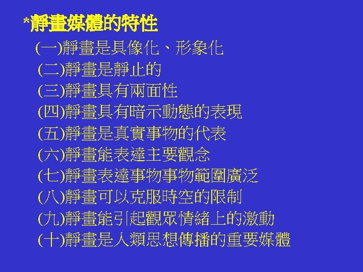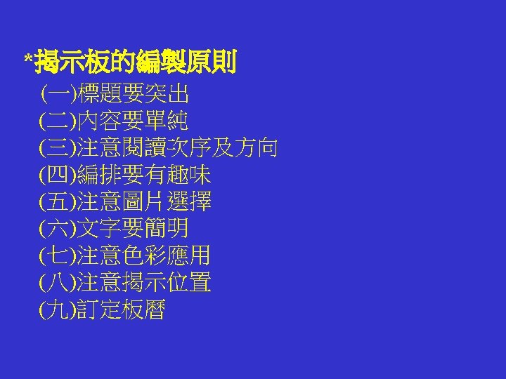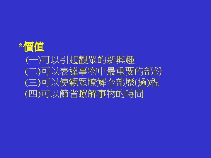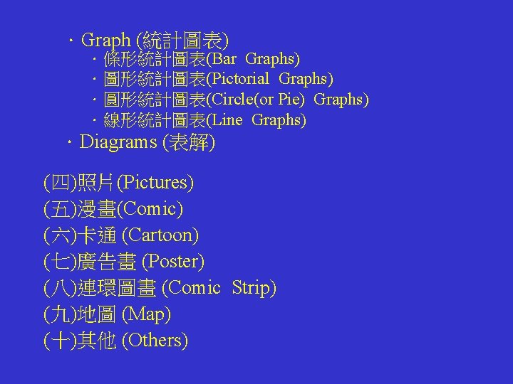Nonprojected Visuals Still Pictures Drawings Charts Organization Charts Slides: 31 Download presentation 非放映性視覺媒體 (Nonprojected Visuals) *靜畫(Still Pictures) *圖畫(Drawings) *圖表(Charts) .組織系統圖表(Organization Charts) .分類圖表(Classification Charts) .編年圖表(Time Lines) .明析表(Tabular Charts) .流程圖表(Flow Charts) Verbal Symbols Visual Symbols Recording. Radio Still Pictures Motion Pictures Television Exhibits Field Trips Demonstrations Dramatized Experiences Contrived Expressions Direct, Purposeful Experiences 分類圖表 明析表 Import Percentages Wheat Cotton Steel Oil *統計圖表(Graphs) .條形統計圖表(Bar Graphs) .圖形統計圖表(Pictorial Graphs) .圓形統計圖表(Circle(or Pie) Graphs) .線形統計圖表(Line Graphs) *海報(廣告畫) (Posters) *卡通(Cartoons) *展示板面(Display Surfaces) .粉筆板(Chalkboards) .多用途板(Multipurpose Boards) .電子板 (Copy Boards) .打洞板 (Pegboards) .揭示板 (Bulletin Boards) .布板 (Cloth Boards) .磁鐵板 (Magnetic Boards) .掛圖 (Flip Charts) *展覽 (Exhibits) .陳列(Displays) .立體圖型 (Dioramas) 靜畫媒體(Still Pictures) *靜畫媒體的涵義 *靜畫媒體的種類 (一)圖畫 (二)圖片 (三)圖表 .Charts (一般圖表) Time Charts (時間性圖表) Chronicle Charts(編年圖表) Tree Charts(樹示圖表) Stream Charts(河流式圖表) Organization Charts(組織系統圖表) Flow Charts(流程圖圖表) Flip Charts(翻閱圖表) Comparison Charts(比較性圖表) Contrast Charts(對比性圖表) 免費和便宜的資料 (Free and Inexpensive Materials) 優點 (Advantages) • 時效性 (Up-to-date) • 深度評論 In-depth treatment • 多樣性 (Variety of uses) • 學生可更改 (Student manipulation) 限制 (Limitations) • 成見或廣告 (Bias or advertising) • 特殊利益 (Special interests) • 數量有限 (Limited quantities) 應用 (Applications)