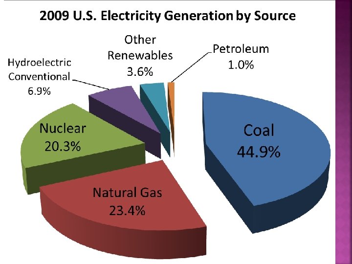 Starts with sun, and the potential energy is converted into electricity Ultimate goal is to spin a turbine (fluid). Usually done with steam (burn coal to get steam) Spinning turbine spins a generator that creates electricity that gets sent through transmission lines Capacity is the maximum potential output Cogeneration is the use of fuel to generate electricity and heat Can be 90% efficient vs. 35% for just electricity