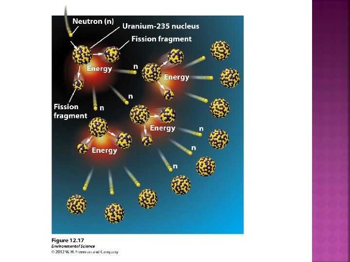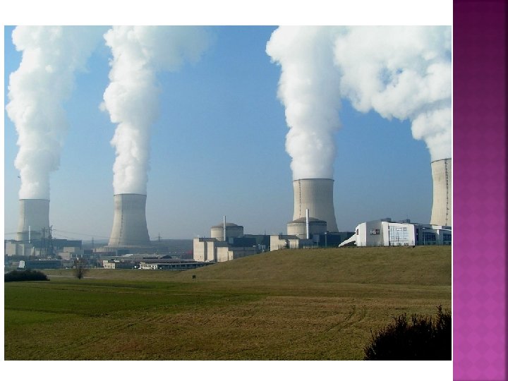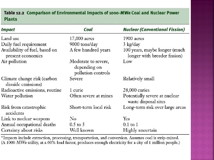 Pros Very concentrated (1” pellet = 1 ton of coal) Not much pollution Less radiation than fossil fuel plant Cons Expensive to maintain and build Need to store and move nuclear waste (10 -100 thousands of years) Meltdowns Thermal pollution Nuclear weapons