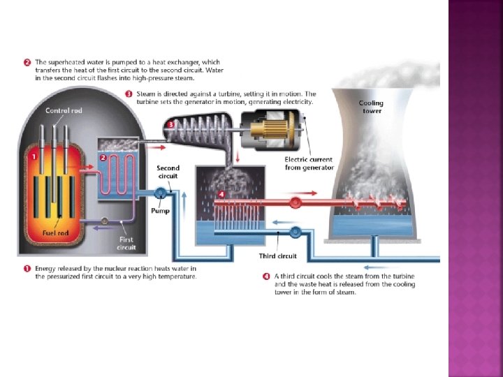 Split the atoms Fuel rods are cylindrical tubes that contain uranium pellets Metal control rods absorb excess neutrons to avoid an uncontrollable reaction Control rods are lowered between fuel rods to control the rate of fission (absorb excess neutrons) Water is between fuel and control rods to act as coolant Heat release generated electricity Breeder reactors use uranium-238 which produces plutonium in the end. Makes more fuel! Meltdown easy far more dangerous, and nuclear weapons