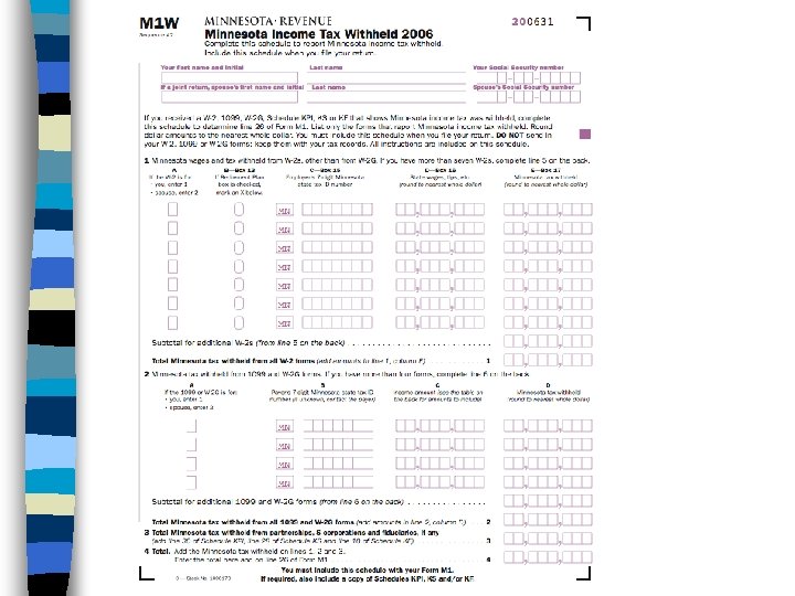 Filling out the M 1 W - W-2 1042 S n Box 15 - MN ID…………. . . n Box 23 n Box 16 - State Wages……. . . n Box 2 Gross n Box 17 - MN Withholding. . . n Box 22 n Box 24 - name of state Only need to fill in this form if there is state taxes withheld…. . usually no state tax on 1042 S