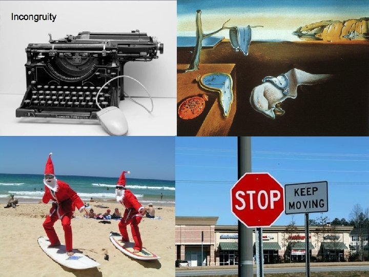 Incongruity We laugh when we notice the incongruity, when something doesn’t match the expectation. The noticing is more important than the actual incongruity. • A very short and fat man holding hands with a very tall, thin woman. • A very sophisticated-looking person acts silly • Exaggeration & Surprise • Seeing a white rabbit with a waistcoat and a watch, and not thinking it odd, at first.