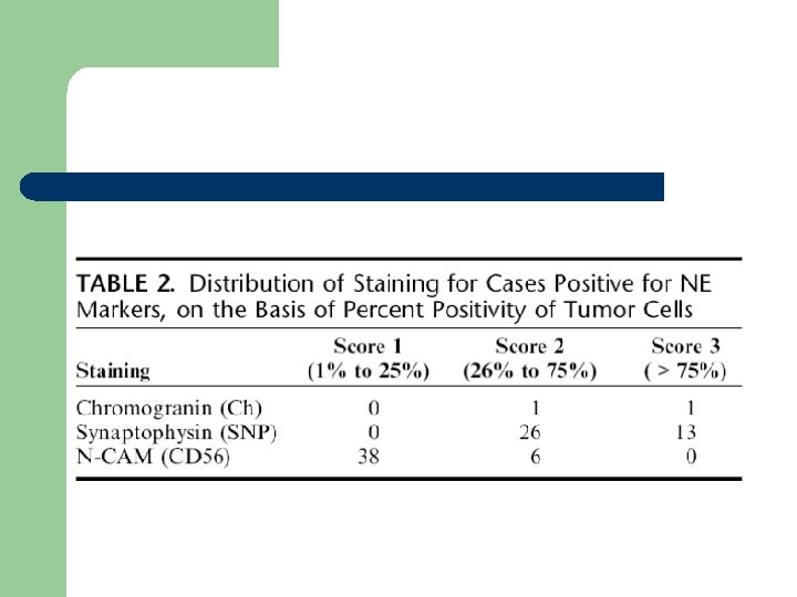 l The use of 0. 6 -mm cores for TMA construction may have decreased the number of cases with scattered focal expression of NE markers that would be identified as NE positive. l On the basis of our previous experience in other type of cancers with NE expression, we would not anticipate missing any cases with strong NE marker expression with this approach.