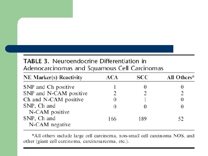 Previous studies have identified NE differentiation in NSCLC in 10 to 70% of cases. l Studies with more specific NE markers, such as Ch, SNP, and N-CAM, positivity typically ranges between 10 to 30%. →results of earlier studies should be interpreted with caution l l Even when similar antibody panels have been used, what is considered positive in different studies has varied.