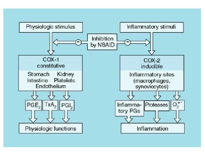 Cyclo-oxygenase (COX) • Exists in the tissue as constitutive isoform (COX-1). • At site of inflammation, cytokines stimulates the induction of the 2 nd isoform (COX-2). • Inhibition of COX-2 is thought to be due to the anti-inflammatory actions of NSAIDs. • Inhibition of COX-1 is responsible for their GIT toxicity. • Most currently used NSAIDs are somewhat selective for COX-1, but selective COX-2 inhibitors are available.