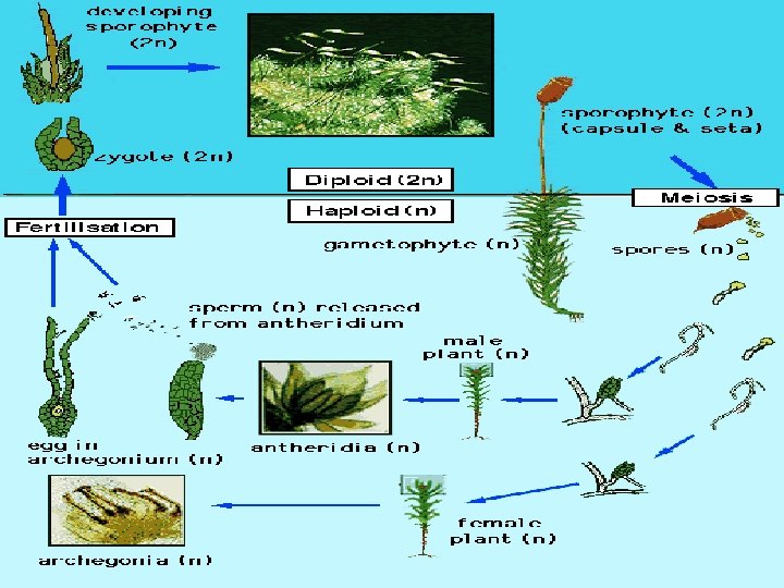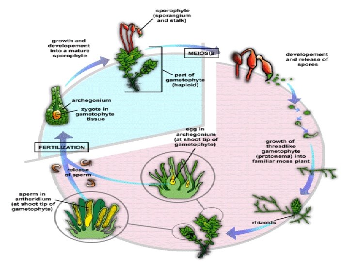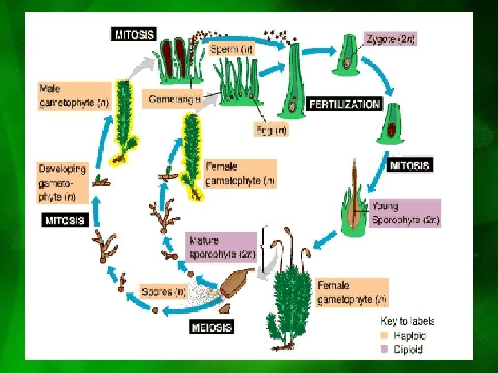 PHYLUM BRYOPHYTA • • Environment: water Moist habitat and nutrient poor soil Can tolerate low temp STRUCTURE – Stalk + capsule= sporophyte – Leaf like and stem like structure • gametophyte • Life cycle (http: //www. zo. utexas. edu/faculty/sjasper/bio 213/plants. html)