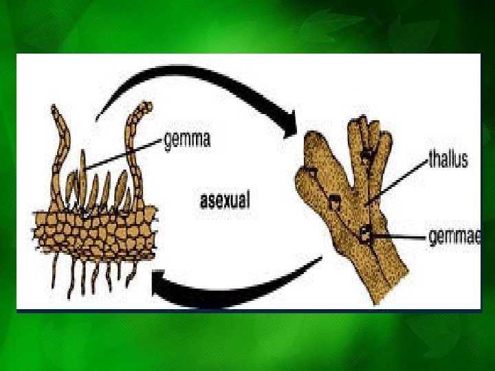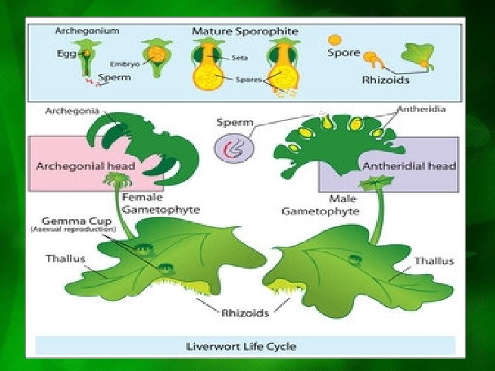 PHYLUM HEPATOPHYTA • Liverworts • Gametophyte: umbrella like (gametangia) – Archaegonium – Antheridium • ASEXUAL REPRODUCTION: Gemmae – Haploid cells – Gemmae cups
