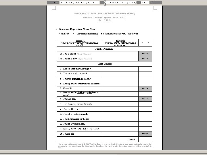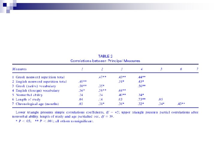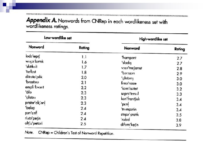 Archibald, L. M. D. , & Gathercole, S. (2006). Nonword repetition: A Journal of Speech, Language, and Hearing . comparison of tests . Research, 49, 970– 983 n n Subjects: 36 native speakers: 12 SLI (9; 8), 12 TD age (9; 9), 12 TD language (6; 1). Same SES Scores on standardized test:
