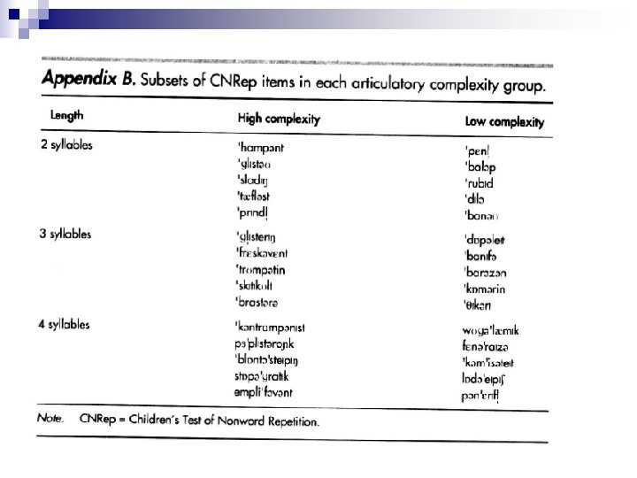 CNRep - Children's Test of Nonword Repetition Gathercole, S. E. , Willis, C. S. , Baddeley, A. D. , and H. Emslie H. (1994) The Children's Test of Nonword Repetition: a test of phonological working memory. Memory 2(2): 103 -27. (Tables from Archibald, L. M. D. , & Gathercole, S. (2006))
